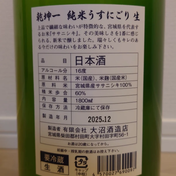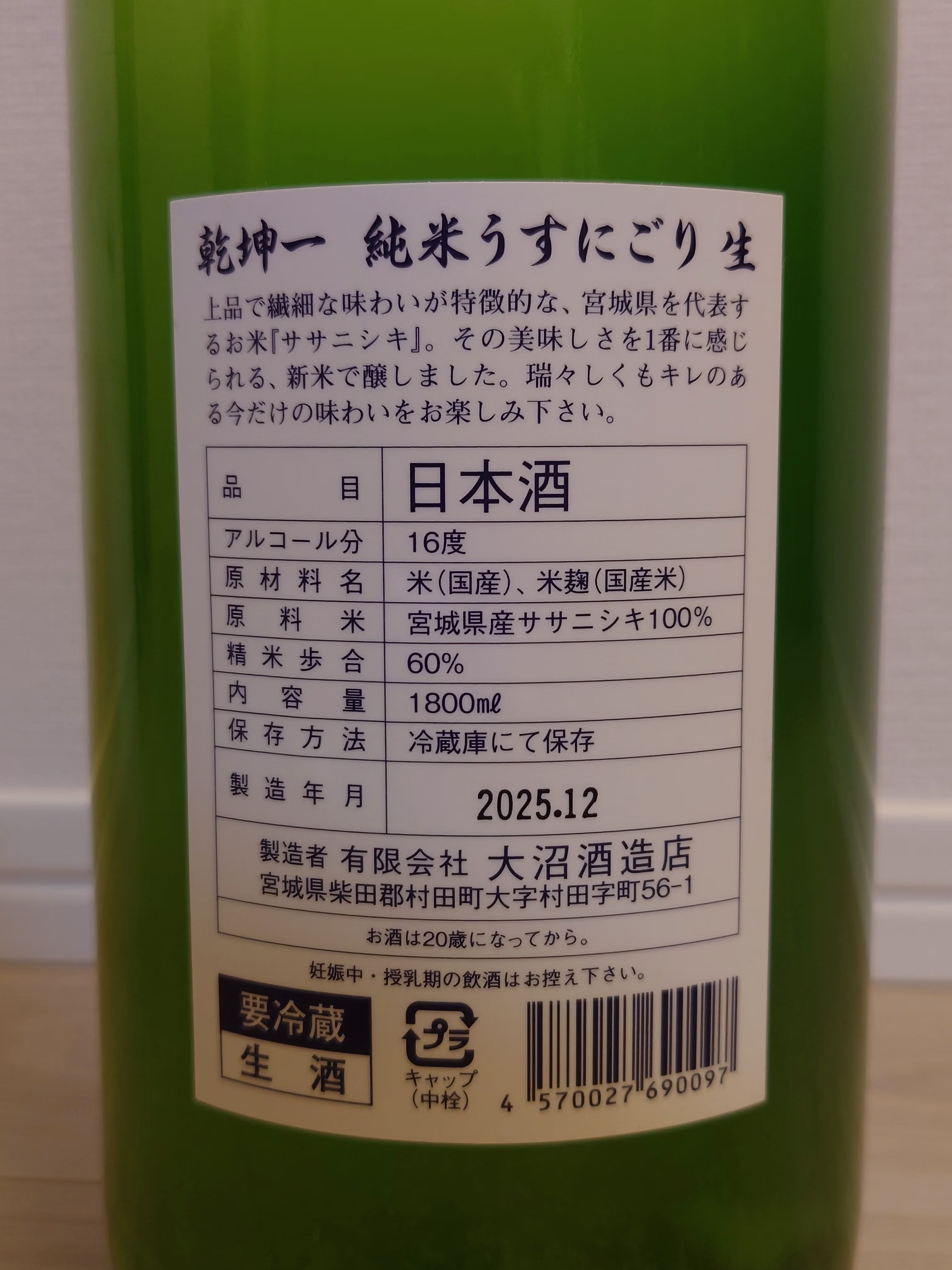 ㈲大沼酒造店さんの乾坤一 純米 うすにごり 生。わずかに黄色。弱めのミルキーな粕の香り。優しくふわりとした味わいの酒。カルピスのような乳酸系の優しい甘さが広がる。山は低いが裾が長く、じんわりとした余韻がある。 #SAKAZUKI