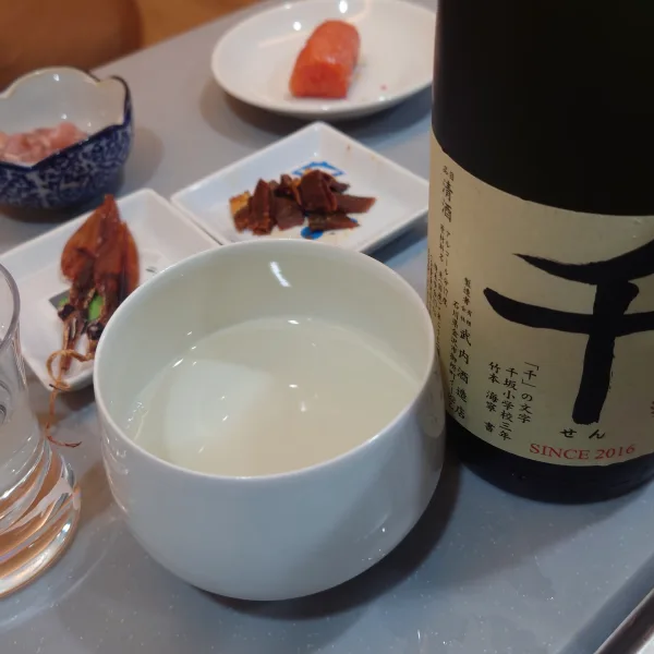 ㈲武内酒造店さんの千 2025 純米生原酒。やや黄色。弱めの緑の葉を感じる香り。生らしさも持つこってり甘旨系。ややどっしりした乳酸や木樽系の複雑さを持つ、渋さ中心の旨味。後から香りが抜け、旨さが長めの余韻をもつ。 #SAKAZUKI